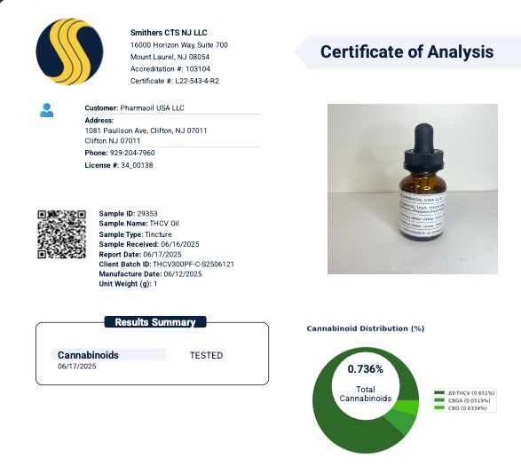 Sample ID: 29353Sample Name: THCV OilSample Type: TinctureSample Received: 06/16/2025Report Date: 06/17/2025Client Batch ID: THCV300PF-C-S2506121Manufacture Date: 06/12/2025Unit Weight (g): 1