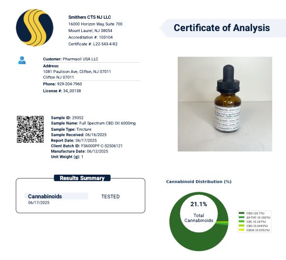 Sample ID: 29352Sample Name: Full Spectrum CBD Oil 6000mgSample Type: TinctureSample Received: 06/16/2025Report Date: 06/17/2025Client Batch ID: FS6000PF-C-S2506121Manufacture Date: 06/12/2025Unit Weight (g): 1