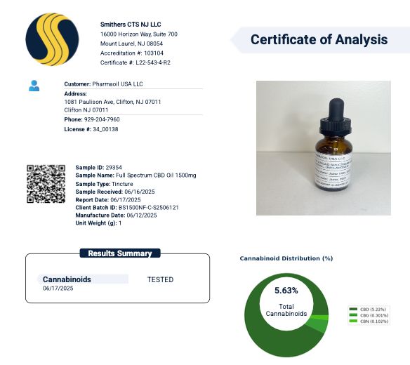 Sample ID: 29354Sample Name: Full Spectrum CBD Oil 1500mgSample Type: TinctureSample Received: 06/16/2025Report Date: 06/17/2025Client Batch ID: BS1500NF-C-S2506121Manufacture Date: 06/12/2025Unit Weight (g): 1