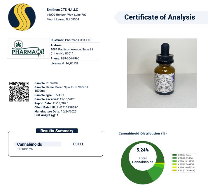 Sample ID: 37899Sample Name: Broad Spectrum CBD Oil1500mgSample Type: TinctureSample Received: 11/13/2025Report Date: 11/13/2025Client Batch ID: PH241025BS1-1Manufacture Date: 10/24/2025Unit Weight (g): 1