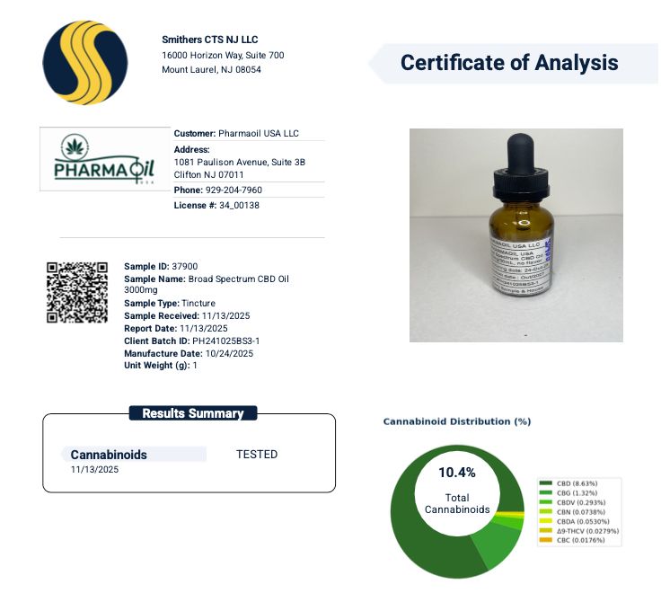 Sample ID: 37900Sample Name: Broad Spectrum CBD Oil 3000mgSample Type: TinctureSample Received: 11/13/2025Report Date: 11/13/2025Client Batch ID: PH241025BS3-1Manufacture Date: 10/24/2025Unit Weight (g): 1