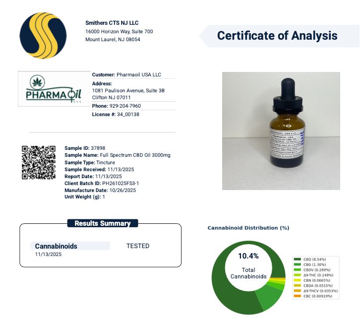 Sample ID: 37898Sample Name: Full Spectrum CBD Oil 3000mgSample Type: TinctureSample Received: 11/13/2025Report Date: 11/13/2025Client Batch ID: PH261025FS3-1Manufacture Date: 10/26/2025Unit Weight (g): 1