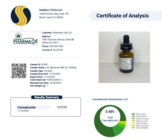 Sample ID: 37897Sample Name: Full Spectrum CBD Oil 1500mgSample Type: TinctureSample Received: 11/13/2025Report Date: 11/13/2025Client Batch ID: PH261025FS1-1Manufacture Date: 10/26/2025Unit Weight (g): 1